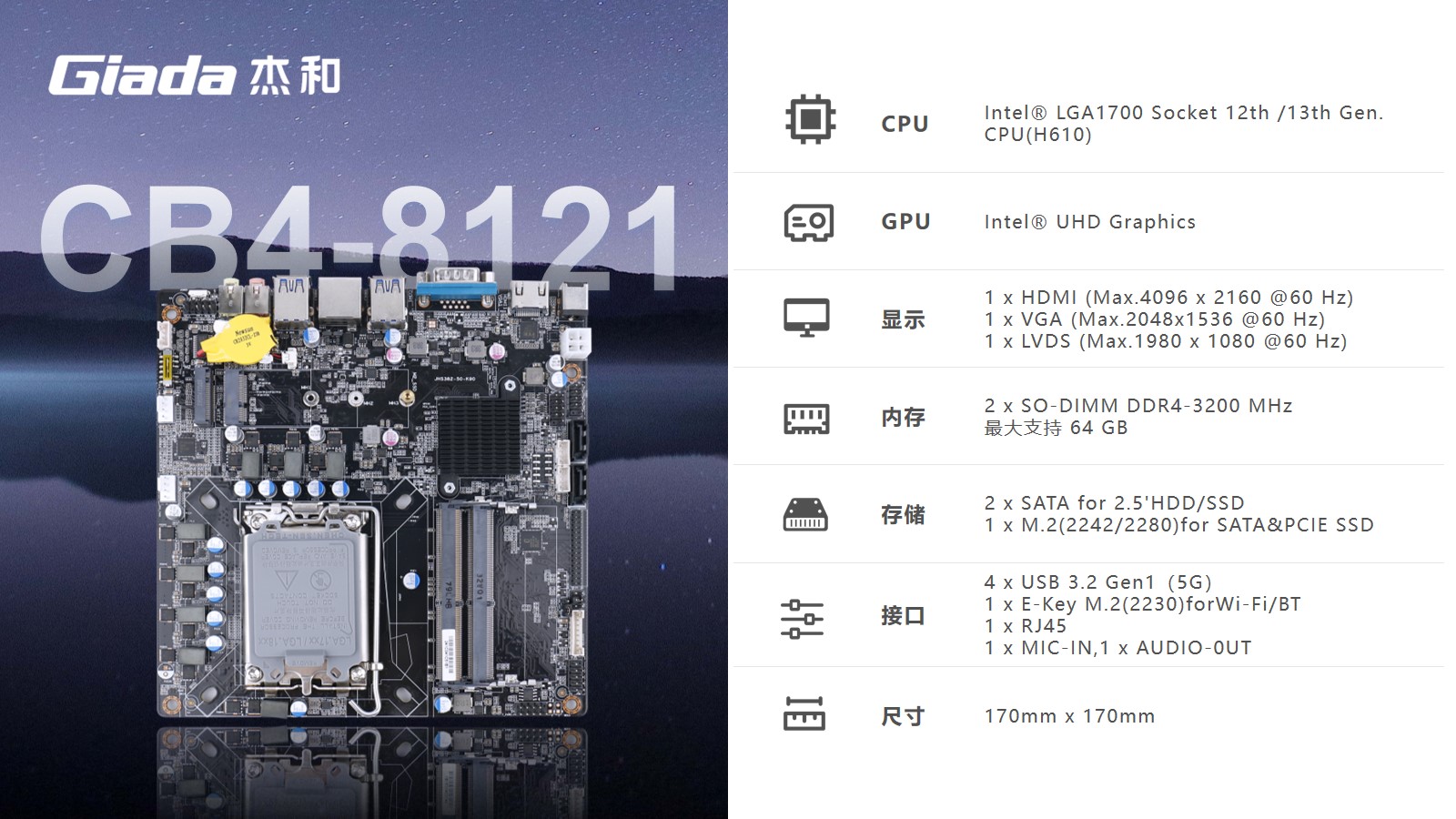 针对客户的多任务处理需求,主板选用2个DDR4 SO-DIMM插槽,支持高达64GB的内存容量,同时配置支持PCIe 3.0通道的M.2接口以及2 x SATA接口,用于连接硬盘。