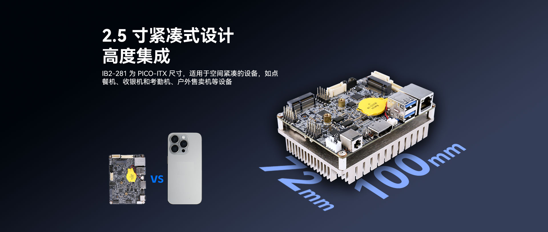无风扇嵌入式主板去掉了风扇这一易损部件,消除了因风扇故障引发的系统问题,提高了系统的稳定性和可靠性。它采用了高度集成化的设计,体积更为小巧,如永利3044官网科技Pico-ITX主板IB2-281,其2.5寸紧凑式设计,适用于点餐机、收银机和户外售卖机等空间有限的应用场景。这种主板通常具备低功耗的特性,减少了能源消耗,也降低了发热。而且,它的稳定性极佳,能适应各种复杂环境。