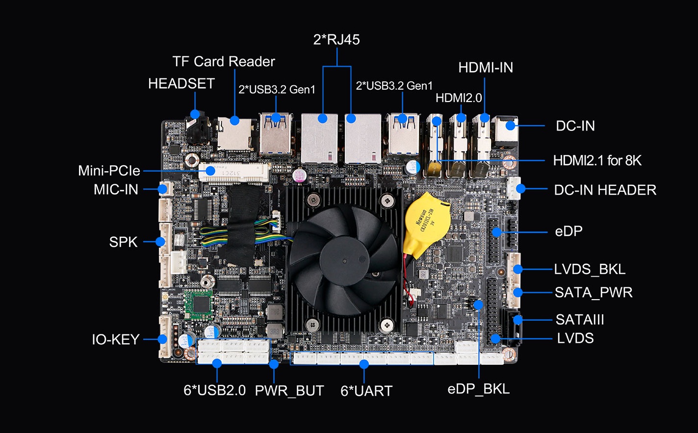 IB3-771支持双路千兆以太网RJ45,支持蓝牙BT模块,支持2.4GHz/5GHz双频WiFi6,支持1 X SIM槽,板载1 X Mini-PCIe卡槽支持扩展4G网络模块,具有灵活的网络应用环境,让网络通讯更稳定的同时,实现更高的通讯速率;支持3 x USB3.0,1 x USB3.0(OTG)接口,支持1 x 二合一音频口,内部接口支持6 x USB2.0,1 x eDP,1 x LVDS,1 x MIPI-CSI jack,2 x RS232 header, 2 x RS485 header,2 x TTL,1 x IO-KEY, 1 x IR,1 x MIC-IN,1 x SPK等接口,丰富的I/O功能接口,实现更多功能扩展。