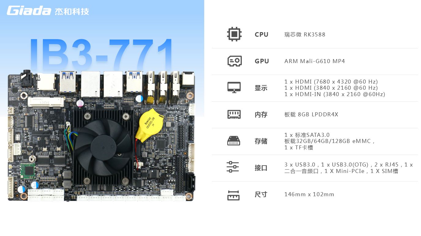 永利3044官网科技IB3-771基于Rockchip瑞芯微RK3588处理器而开发,RK3588作为瑞芯微新一代旗舰级高端芯片,搭载四核A76+四核A55的八核CPU和ARMG610 MP4 GPU,内置6 TOPs算力的NPU,具有高算力、低功耗、超强多媒体、丰富数据接口等特点,CPU运算能力更强,图形处理能力方面表现出色。