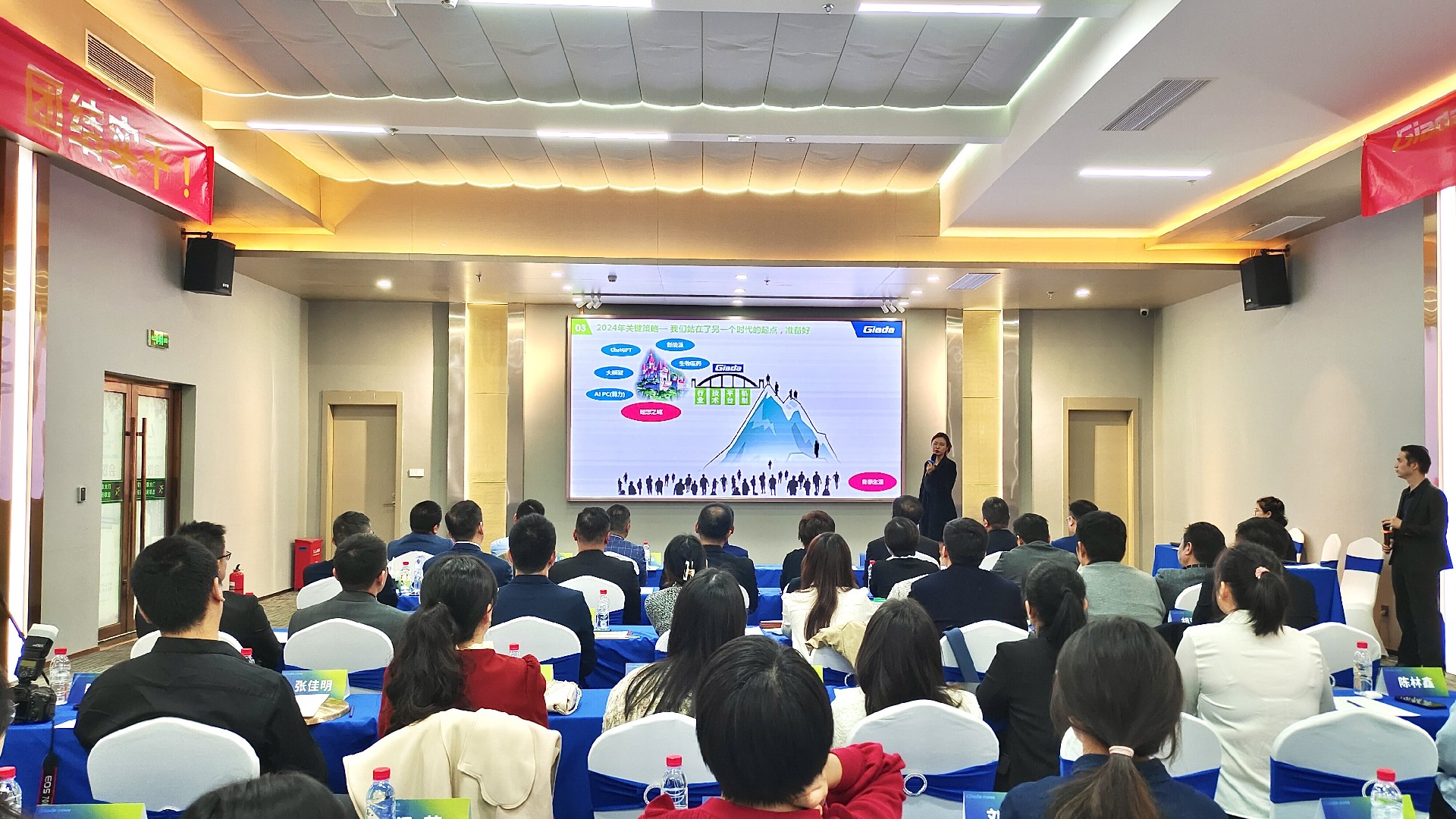 会议开始后,两位国际/国内营销中心负责人首先对2023年度经营工作作总结报告,并着重介绍2024年度销售目标与重点工作。