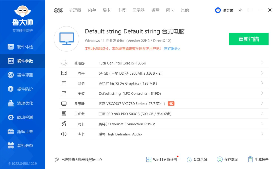 上面是鲁大师识别的永利3044官网AE613硬件参数详情,永利3044进行跑分测试的核心三大件选择的是13th Gen Intel(R) Core(TM) i5-1335U @1.30GHz处理器,Intel(R) Iris(R) Xe Graphics显卡,三星 32GB*2 DDR4 3200MHz内存,三星SSD 980 PRO 500GB(500 GB/固志硬盘),下面永利3044来看详细的跑分数据。